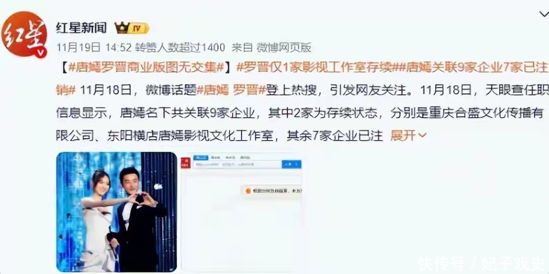 还有人翻出俩人的公司情况,说唐嫣之前关联9家公司,现在只剩2家在运营,罗晋的4家也只剩1家,而且俩人没一起持股的公司,这就是“提前分好财产了”。